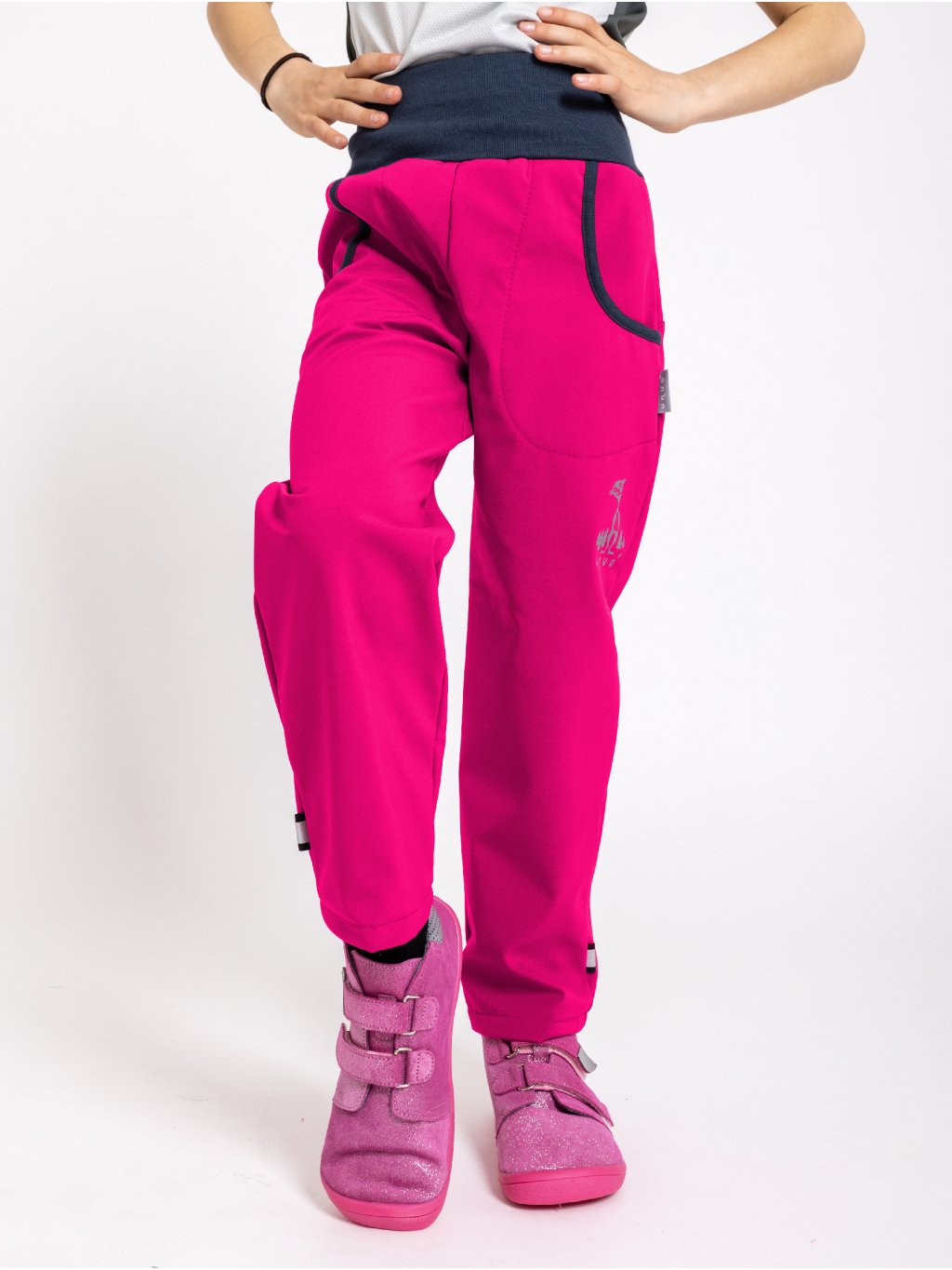 Je název pro střih tak akorát rovný, pěkně padnoucí a vhodný prakticky pro všechny. Čím si získal tento kousek srdce tolika dětí i rodičů? Začněme strategicky rozmístěnými náplety. Náplet jsme navíc opatřili gumou, kterou ocení zejména hubené žížalky, protože je možné ji stáhnout. V opačném případě lze gumu vyjmout a dopřát dětem maximum pohodlí. Kalhoty nejsou zakončeny nápletem, aby byly co nejvíce kalhotové a ne tepláčkové. Na zadní straně nohavice je gumička, která pevně přiléhá k noze a zabraňuje vnikání chladného vzduchu a vody. Jelikož kalhoty nemají na nohou náplety, nemusíte se bát jejich namočení a můžete kalhoty jednoduše oblékat přes boty. Jestli něco maminky nemají rády, tak to je mokré zablácené oblečení, zmuchlané ve školní skříňce. Proto jsme naše kalhoty a bundy opatřily poutkem na zavěšení. Poutko je dostatečně veliké, aby si oblečení pověsily i ty nejmenší ručičky. Poutko také použijete při balení oblečení na cesty.