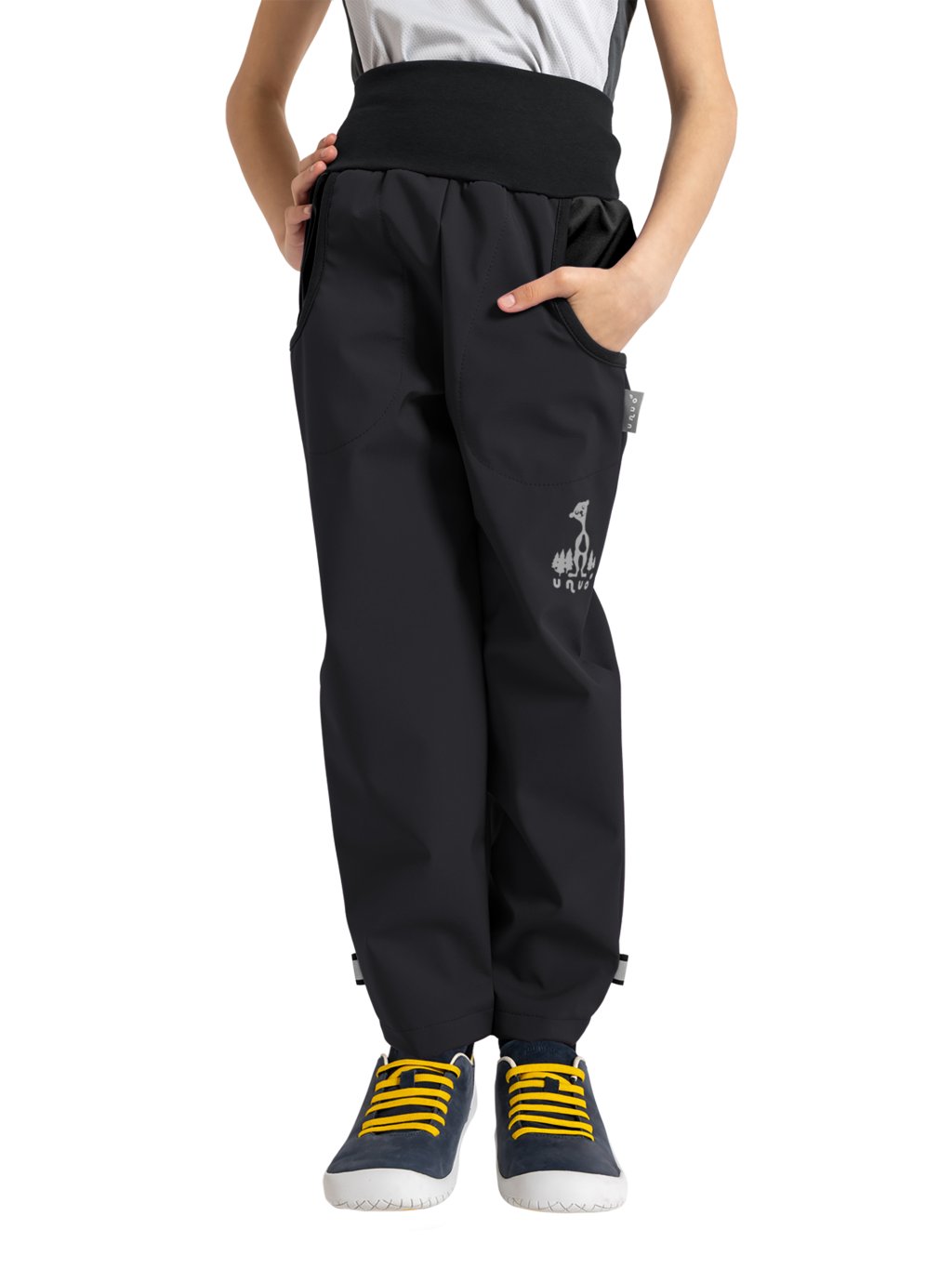 Je název pro střih tak akorát rovný, pěkně padnoucí a vhodný prakticky pro všechny. Čím si získal tento kousek srdce tolika dětí i rodičů? Začněme strategicky rozmístěnými náplety. Náplet jsme navíc opatřili gumou, kterou ocení zejména hubené žížalky, protože je možné ji stáhnout. V opačném případě lze gumu vyjmout a dopřát dětem maximum pohodlí. Kalhoty nejsou zakončeny nápletem, aby byly co nejvíce kalhotové a ne tepláčkové. Na zadní straně nohavice je gumička, která pevně přiléhá k noze a zabraňuje vnikání chladného vzduchu a vody. Jelikož kalhoty nemají na nohou náplety, nemusíte se bát jejich namočení a můžete kalhoty jednoduše oblékat přes boty. Jestli něco maminky nemají rády, tak to je mokré zablácené oblečení, zmuchlané ve školní skříňce. Proto jsme naše kalhoty a bundy opatřily poutkem na zavěšení. Poutko je dostatečně veliké, aby si oblečení pověsily i ty nejmenší ručičky. Poutko také použijete při balení oblečení na cesty.