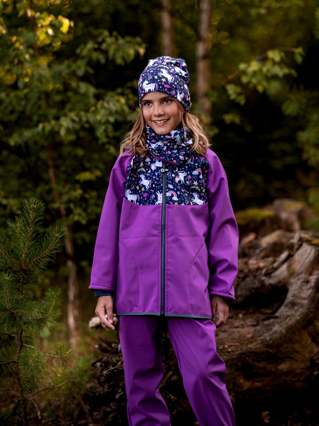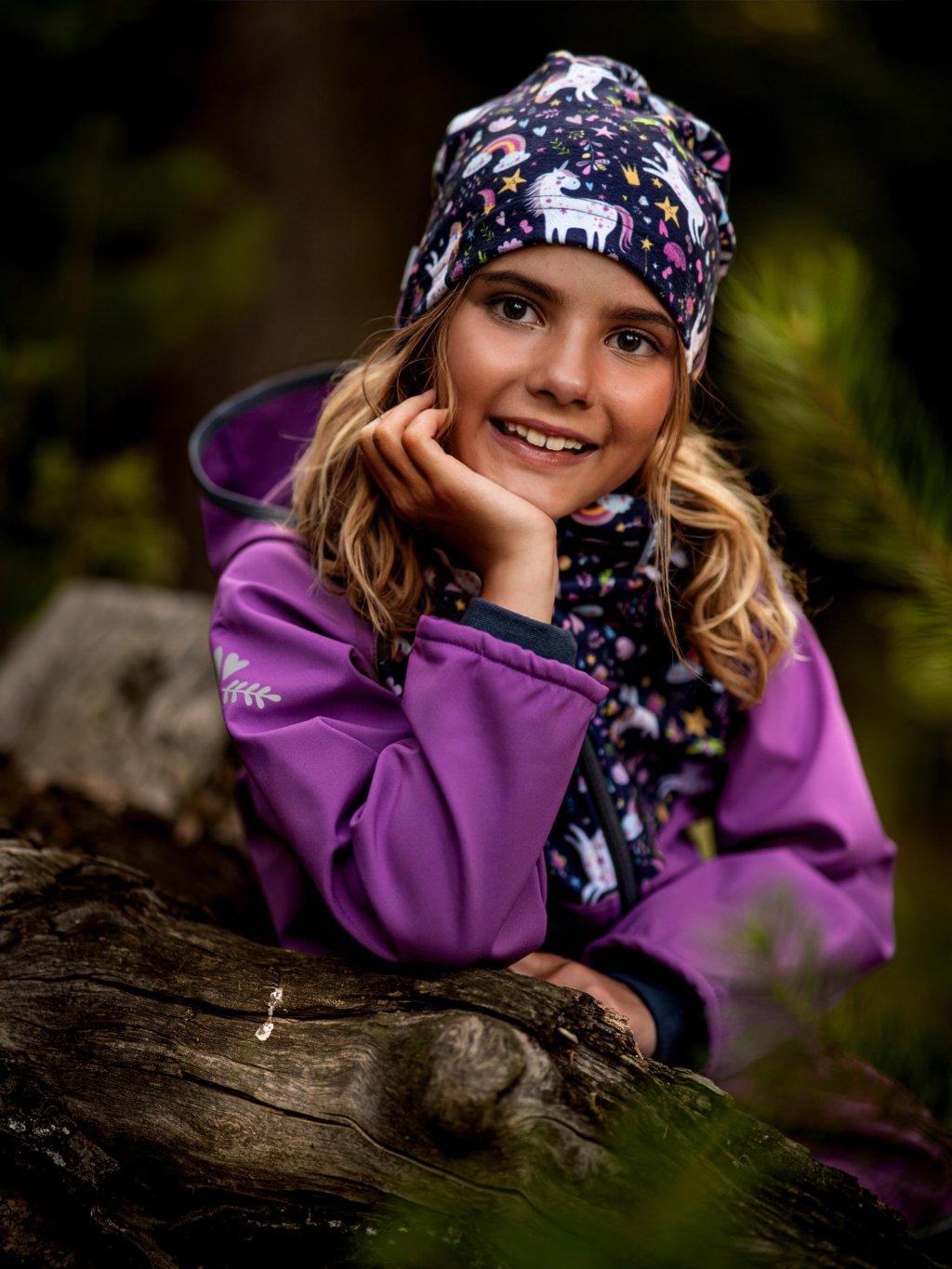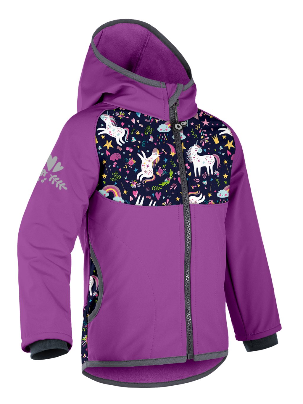 II. jakost, Dětská softshellová bunda s fleecem Basic, Ostružinová, Jednorožci